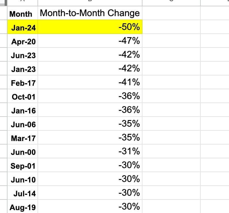 I’ve got monthly Border Patrol data going back to October 1999, and 50 percent is the steepest one-month drop of all of those 24+ years. Steeper than the first full month of the pandemic (April 2020). Steeper than the first full month after Title 42 ended (June 2023).