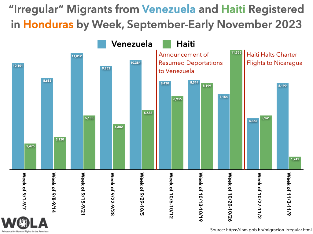 The chart also shows citizens of Haiti (green), whose numbers rose then fell during the same period. The recent drop owes to the Haitian government, at strong U.S. suggestion, banning charter flights to Nicaragua at the end of October.