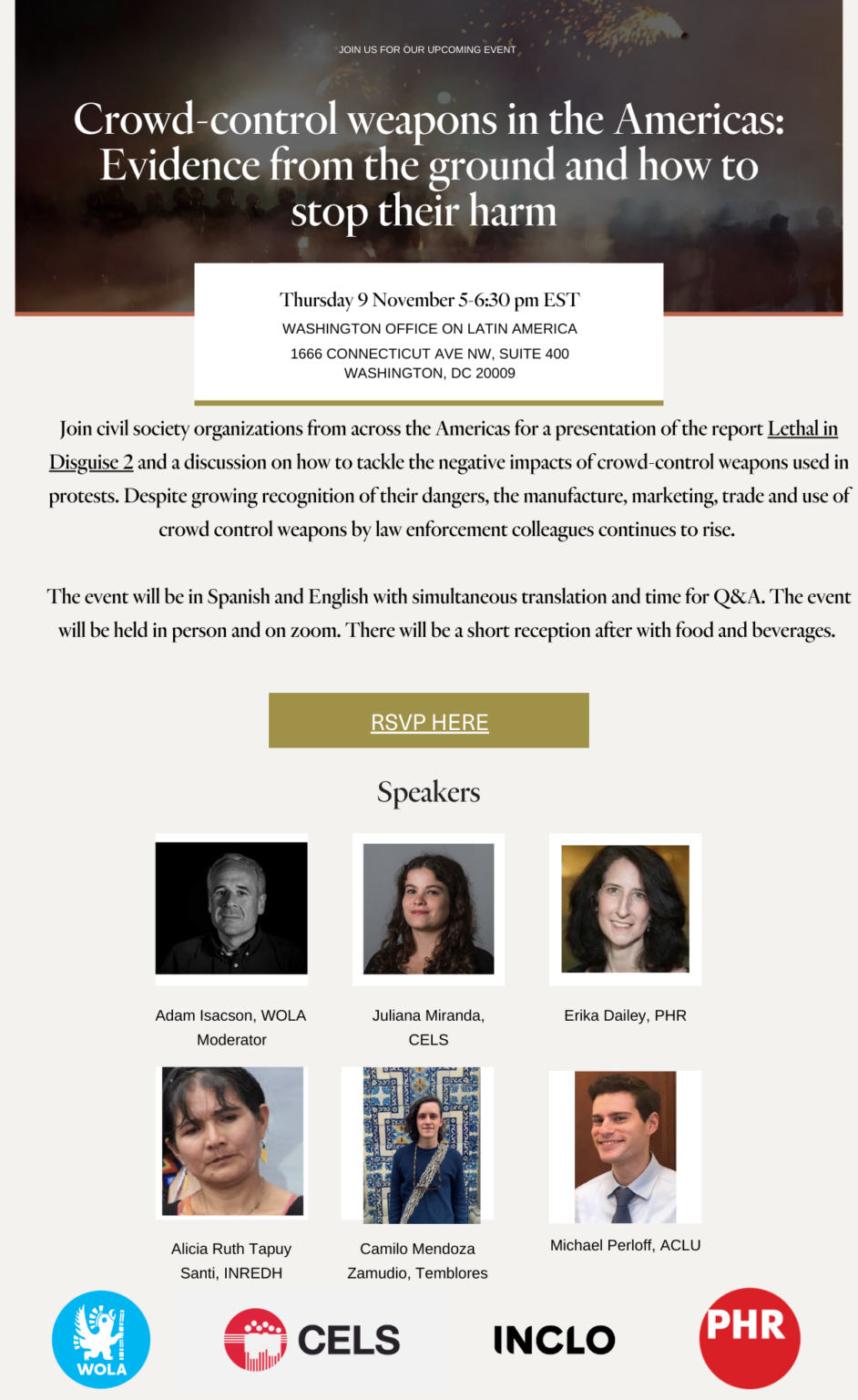 The event is Thursday at 5:00PM, after their hearing, live at WOLA's offices and online.