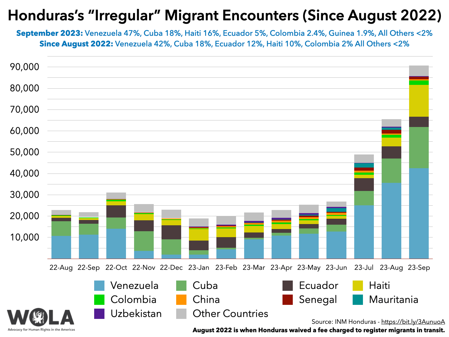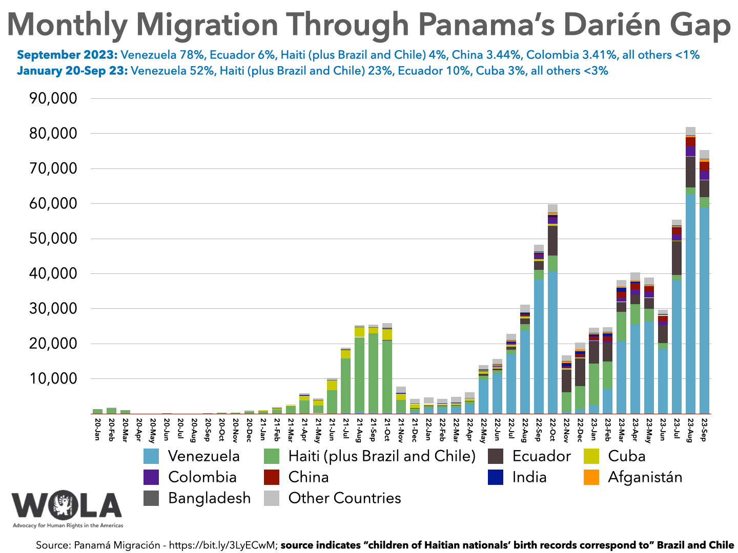 After three months of sharp growth, migration may be leveling off or even declining since mid-September, according to partial data and anecdotal evidence. September data show a very slight August-to-September reduction in near-record migration through Panama’s Darién Gap Region, and a sharp rise in the number of people traveling through Honduras.