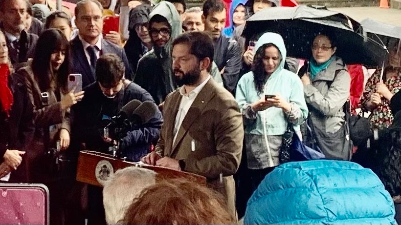 Here's a poor quality mobile phone photo of Chile President Gabriel Boric on September 23 in Washington’s Sheridan Circle, at a memorial of the 1976 state terrorist attack there that killed Orlando Letelier, the foreign minister in Salvador Allende's government, and Ronni Karpen Moffitt of the Institute for Policy Studies.